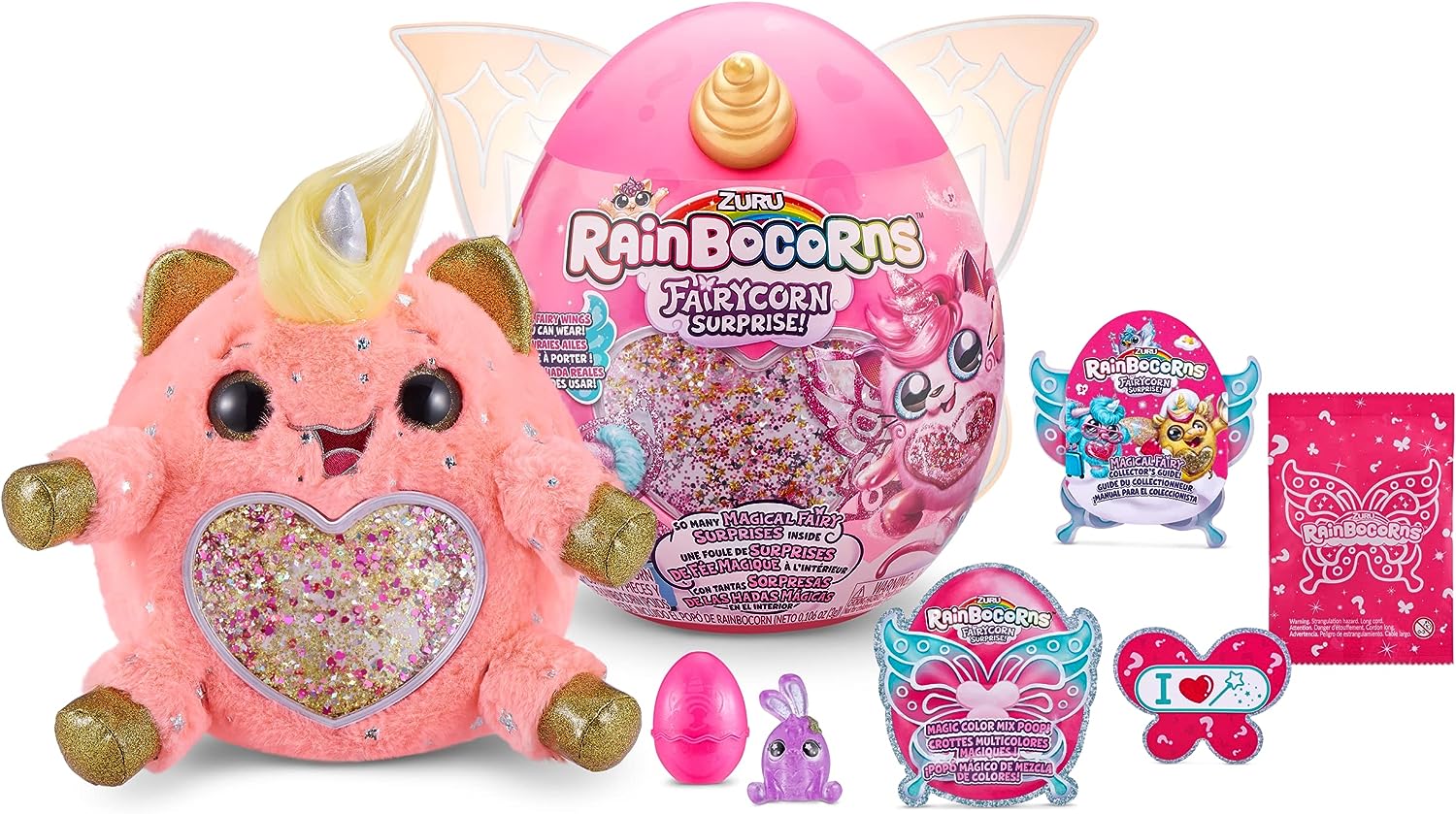 Vei gasi aici o jucarie de plus dornica sa-ti ofere imbratisari moi, un mini ou cu o jucarie surpriza in interior, stickere colorate, o inimia cu slipici senzationala, un pachetel deosebit cu slime, instructiuni si surpriza vestimentara pentru tine - o pereche uimitoare de aripi, pentru a te simti o adevarata zana din povestea magica Rainbocorns.