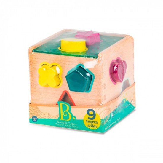 Copilul va invata culorile, formele si dexteritatea. Copilul trebuie sa aleaga figura potrivita pentru fiecare gaura de pe cub. Sortator din lemn cu 9 figuri unice din plastic colorat. Jucaria promoveaza recunoasterea formei si a culorilor, fiind decorate cu ornamente frumoase.
