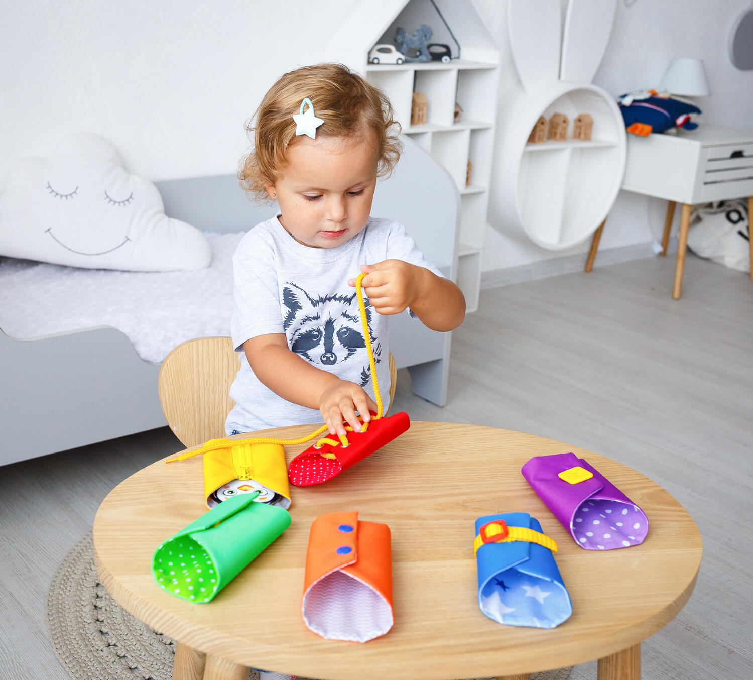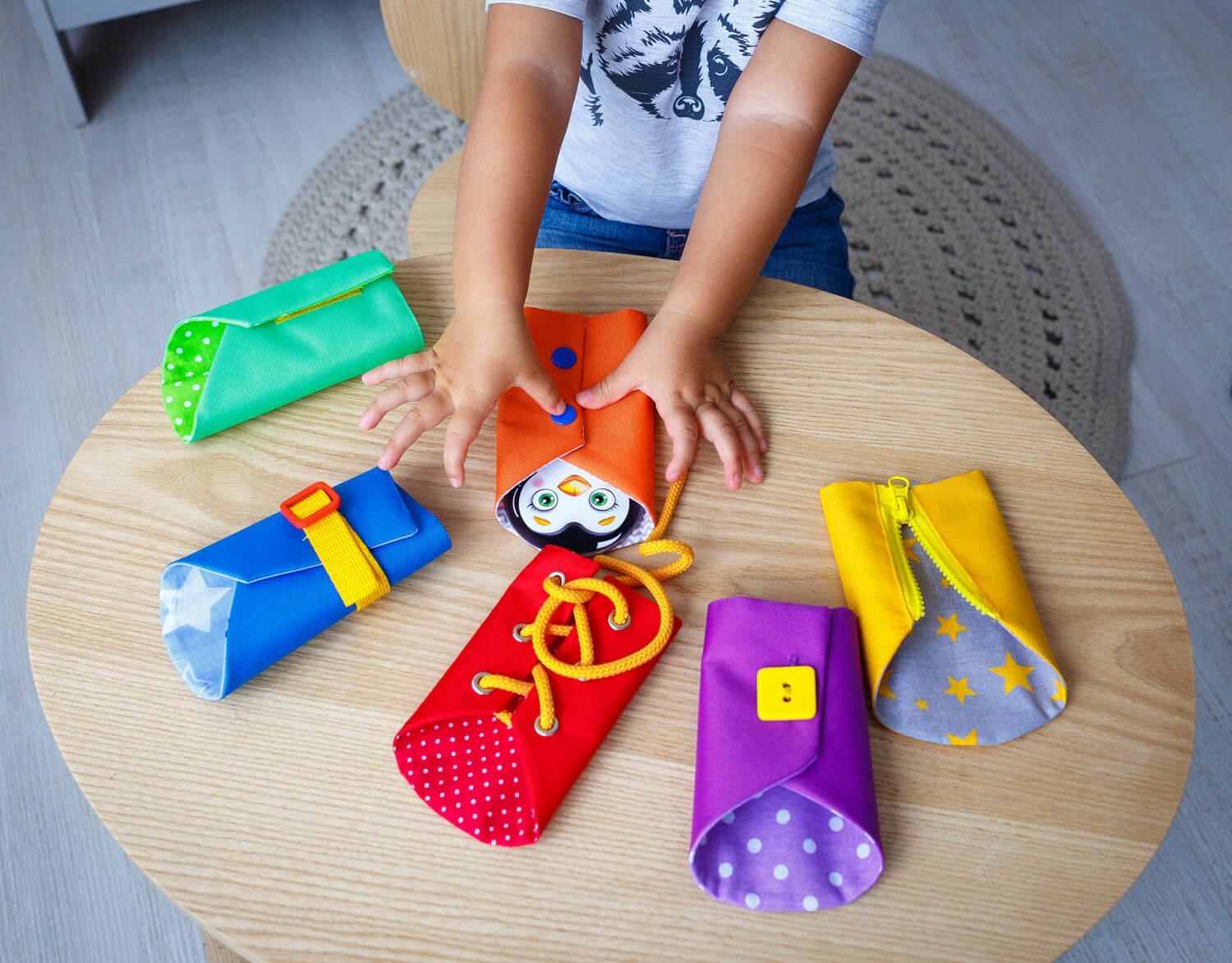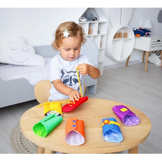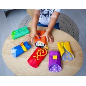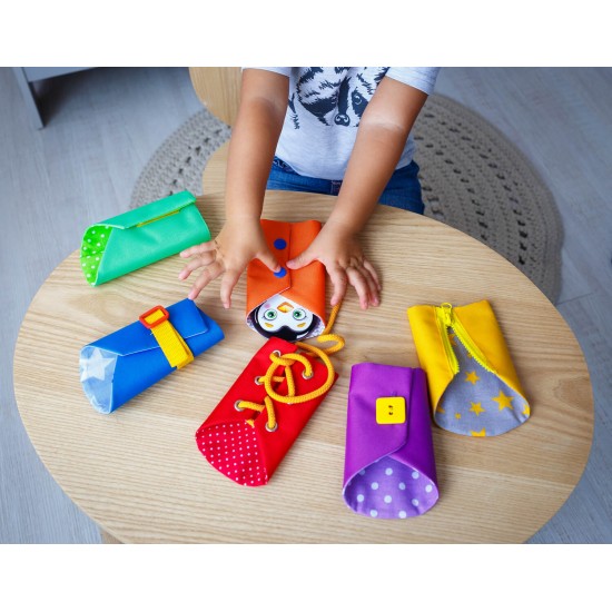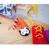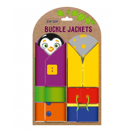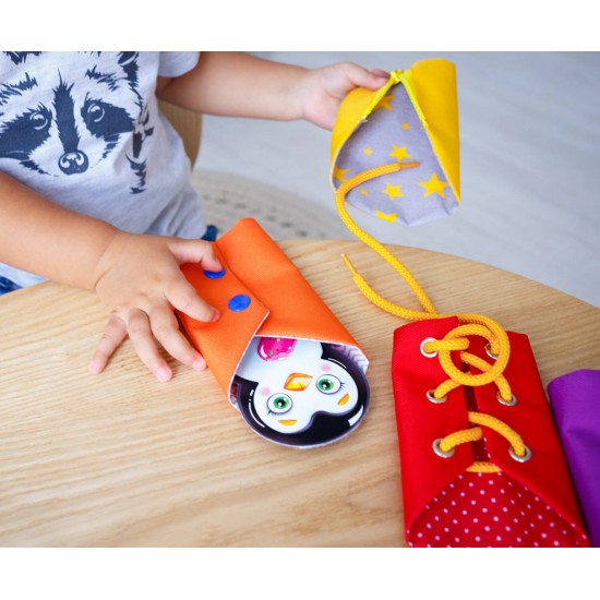 Micul pinguin adora sa schimbe tinutele! Exista multe incuietori diferite pe jacheta lui ... fermoar, nasturi, Fastex si altele. Puneti-l pe copil sa-l ajute pe un prieten in timp ce invata sa-l butoneze si sa-l dezlege.