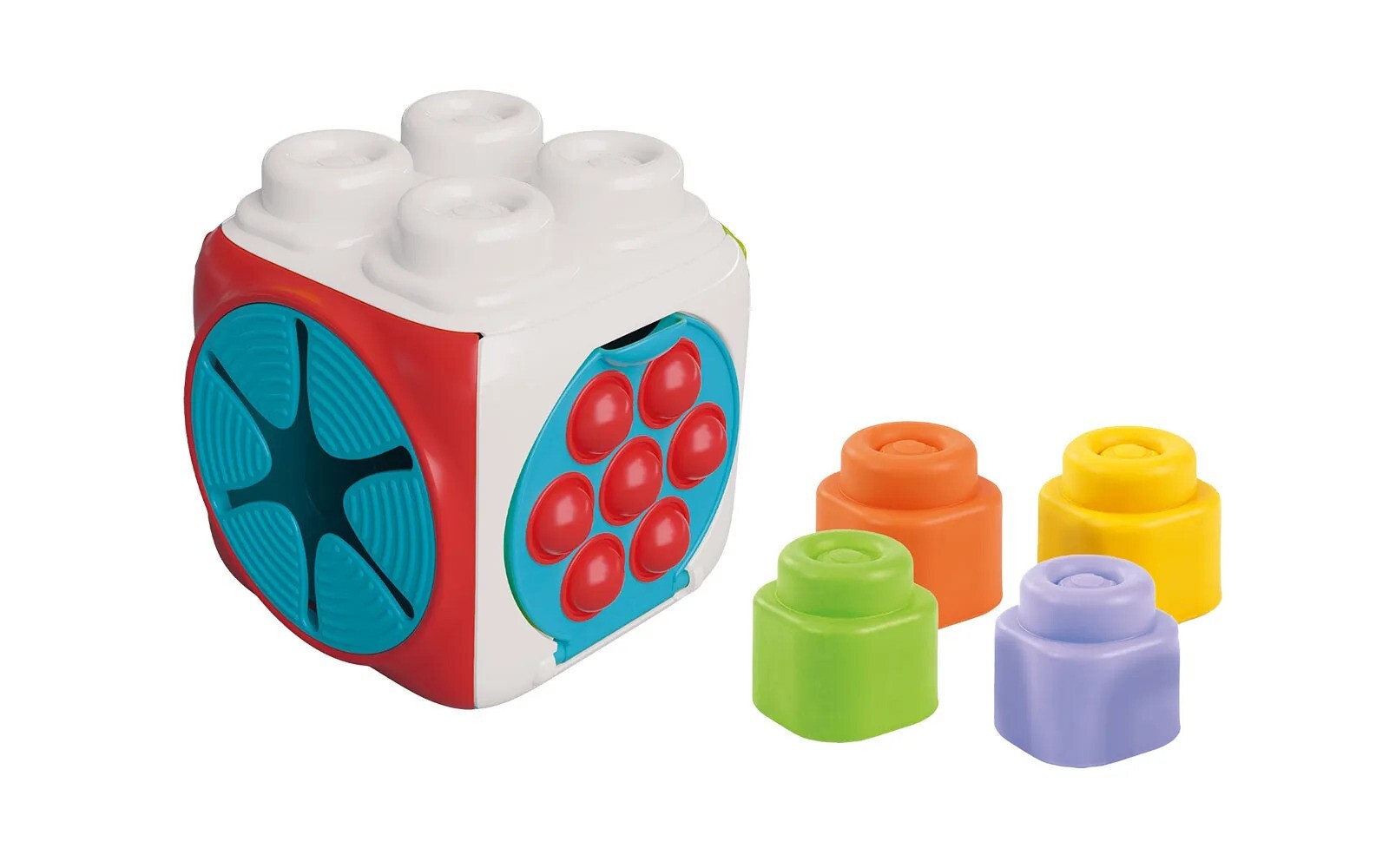 Formele reliefate, culorile vii si partile flexibile ajuta la dezvoltarea coordonarii mana-ochi, a motricitatii fine si a perceptiei senzoriale. Cubul este usor, sigur si ideal pentru joaca zilnica acasa sau in deplasare.