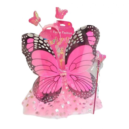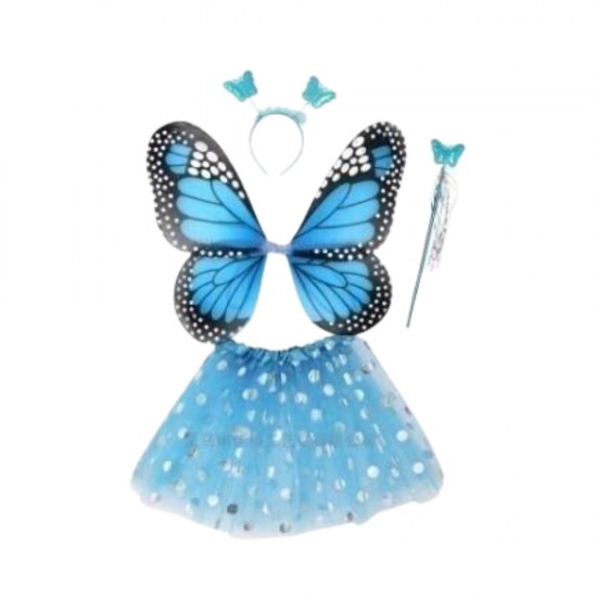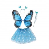 Un set adorabil si plin de culoare pentru copii, perfect pentru carnaval sau petreceri tematice. Aripile de fluture si fustita vaporoasa sunt create dintr-un material usor, in doua nuante, albastra si roz care se potriveste perfect cu tematica fluturas. Aripile au bretele elastice pentru a se fixa confortabil pe spatele copilului. In set ve-i gasi un cerc si o bagheta care va adauga un plus de farmec tinutei.