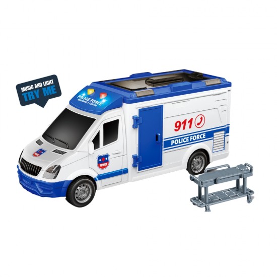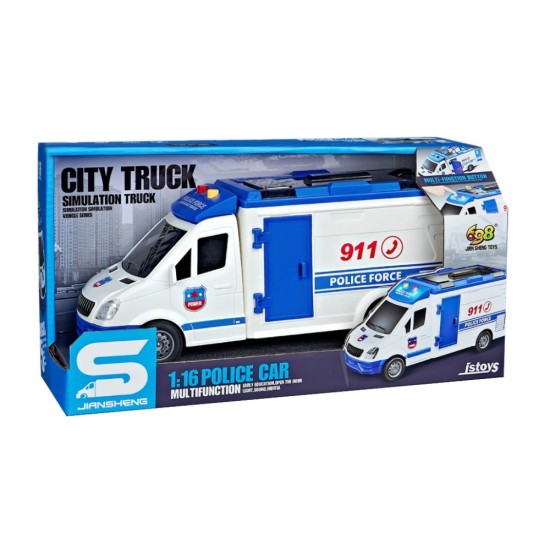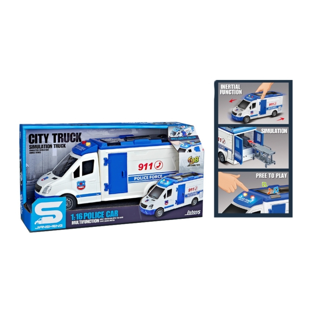Microbuz politie albastru cu frictiune si usi care se deschid, sunete si lumini, 1:16, jstoys, ZJA314889