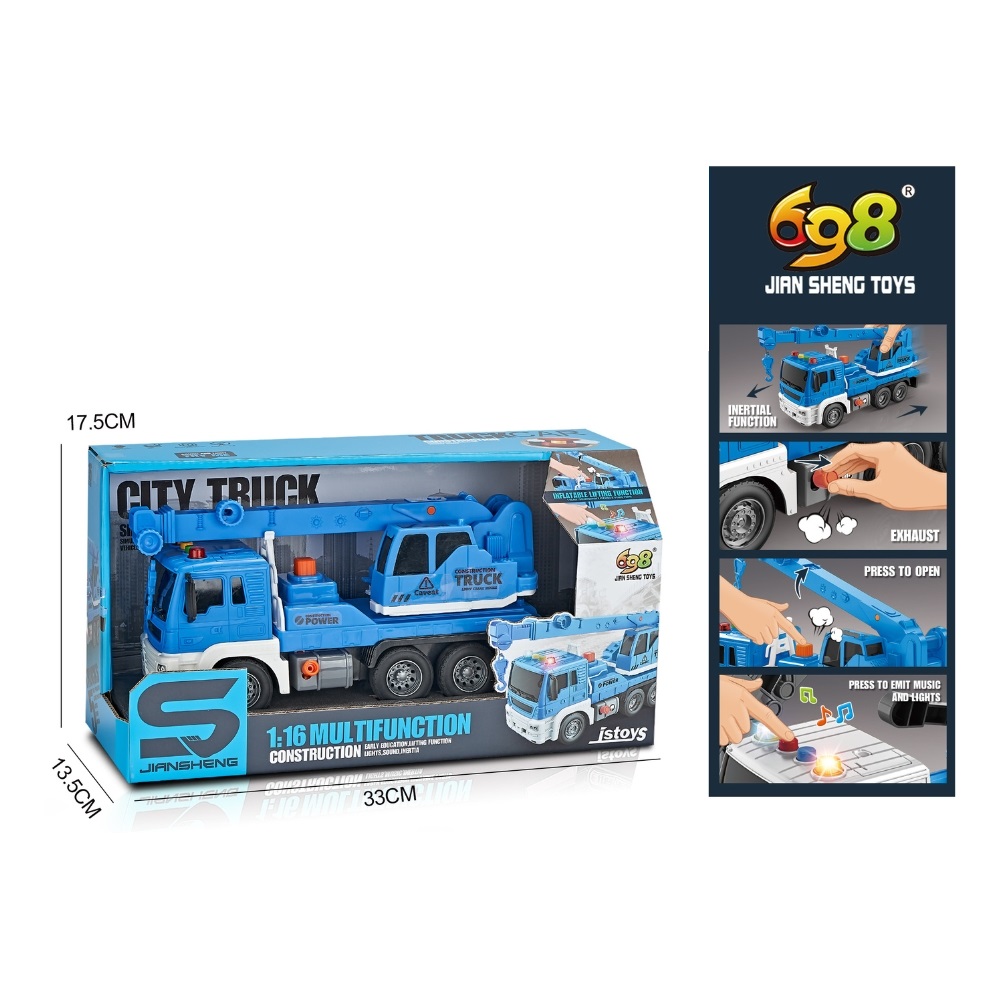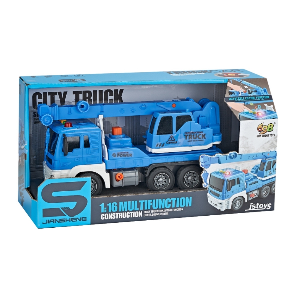 Jucarie Camion macara albastra cu frictiune, buton presiune, sunete si lumini, 1:16, jstoys, ZJA278621