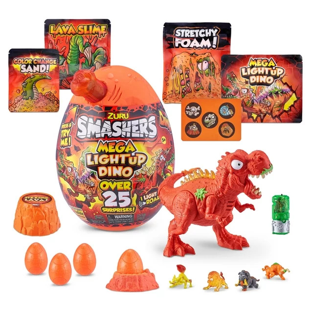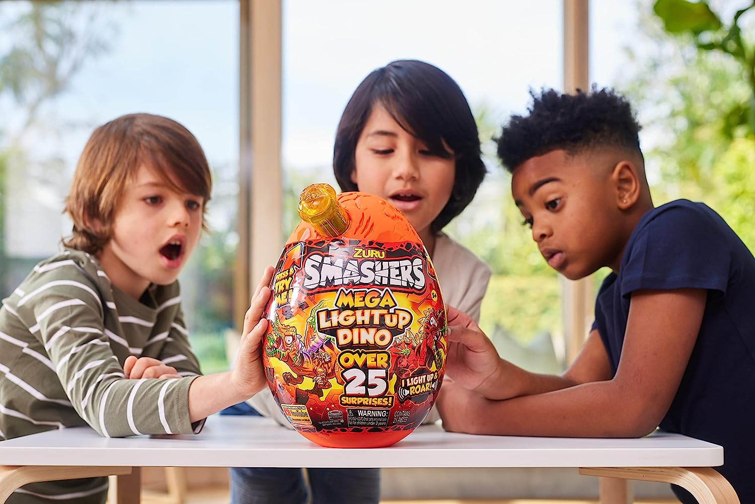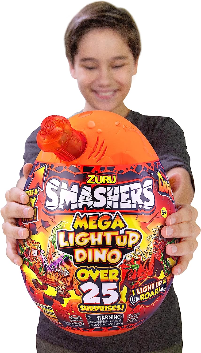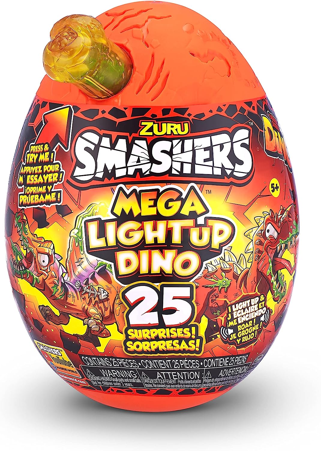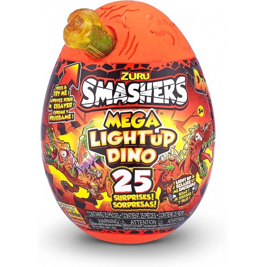 Apasa butonul de pe osul inclus pe oul gigantic si vei vedea luminitele si vei auzi sunetele specifice! Zdrobeste si deschide oul cu figurina dinozaur Smashers Mega Light Up Dino pentru a descoperi cele 25 de surprize din interior. Gaseste toate elementele pentru a asambla fie un Dino T-REX, fie un Spinosaurus.
