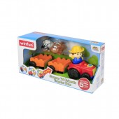 In set vei gasi 2 remorci si doua animalute din cauciuc moale.