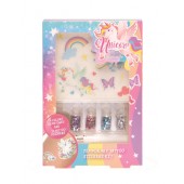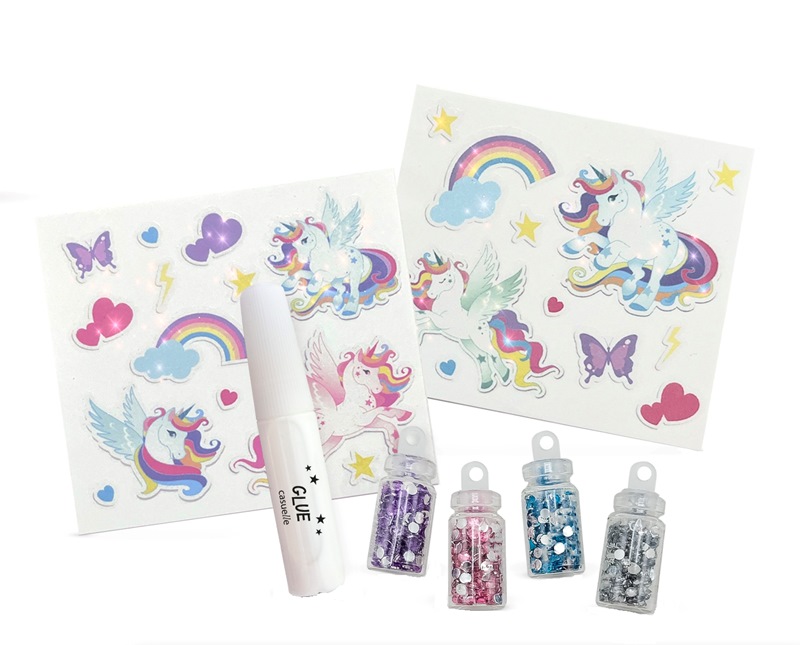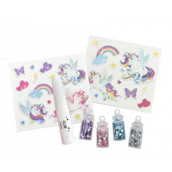Set cu tatuaje temporare Unicorn Casuelle si sclipici.