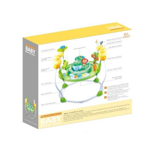Acest scaunel este proiectat pentru indeplinirea mai multor functii, inclusiv de loc de joaca, sau scaun stationar. Datorita stativului bine fixat copilul nu se va putea balansa astfel va fi protejat de accidentare. Datorita efectelor sonore bebelusul se va simti mult mai entuziasmat.