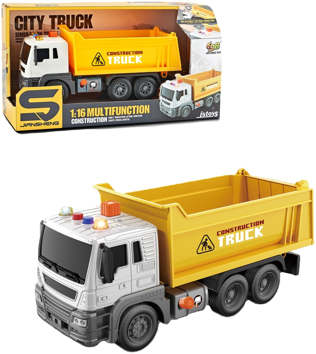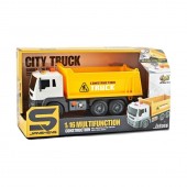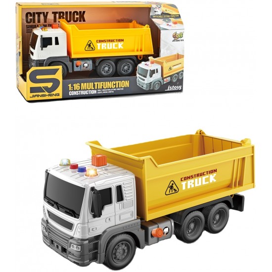 Camion cu remorca, galben, cu frictiune si buton presiune, sunete si lumini 1:16, jstoys